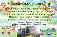Уважаемые, родители! Спешите, спешите, спешите скорей! Проводим для Вас День открытых дверей! Мы будем для Вас детский сад представлять! Покажем как можем учить и играть! Приглашаем Вас на Неделю открытых дверей, которая будет проходить с 24 октября по 28 октября 2022 года!