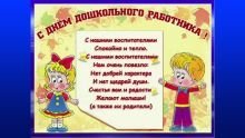 Поздравляем наших любимых, дорогих и уважаемых воспитателей, младших воспитателей и всех, кто работает с детками. Спасибо вам за то, что вы дарите малышам свое тепло, заботу и ласку. Спасибо за ваше бесконечное терпение, душевную доброту и тактичную мудрость. Желаем, чтобы в ваших домах всегда была теплая и благоприятная обстановка. Пускай у Вас в жизни будет только солнечное настроение, отменное здоровье и нескончаемое благополучие. С праздником! -