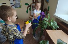 Ребята из старшей группы «Фантазеры» очень любят ухаживать за растениями, которые растут в группе. Под руководством воспитателя Лебедевой Анны Борисовны они учатся поливать растения из лейки, опрыскивать из пульверизатора, очищать листья влажной тряпочкой, а еще могут самостоятельно определить, нуждается растение в поливе или рыхлении.