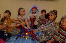 Сегодня на занятии кружка "Соловушка" вместе с Натальей Владимировной ребята из подготовительной к школе группы побывали в гостях у индейцев. Развивая творческую активность, летели на самолёте, разводили костер, придумывали свои тотемы, шли по следам бизона, волка, медведя, превращая эти следы в ритмические рисунки. С удовольствием передавали эмоциональный образ героев с помощью голосовых, пластических, инструментальных импровизаций.