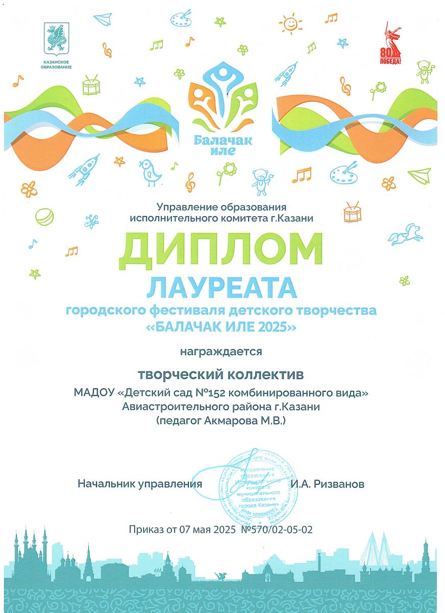 Поздравляем юных танцоров нашего детского сада, а также музыкального руководителя Акмарову Мадину Вадимовну, которые стали лауреатами городского фестиваля детского творчества "Балачак илен 2025", организованного Управлением образования исполнительного комитета г.Казани!