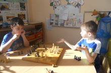 Черно-белая доска, за доской - два игрока. 11.03.2015