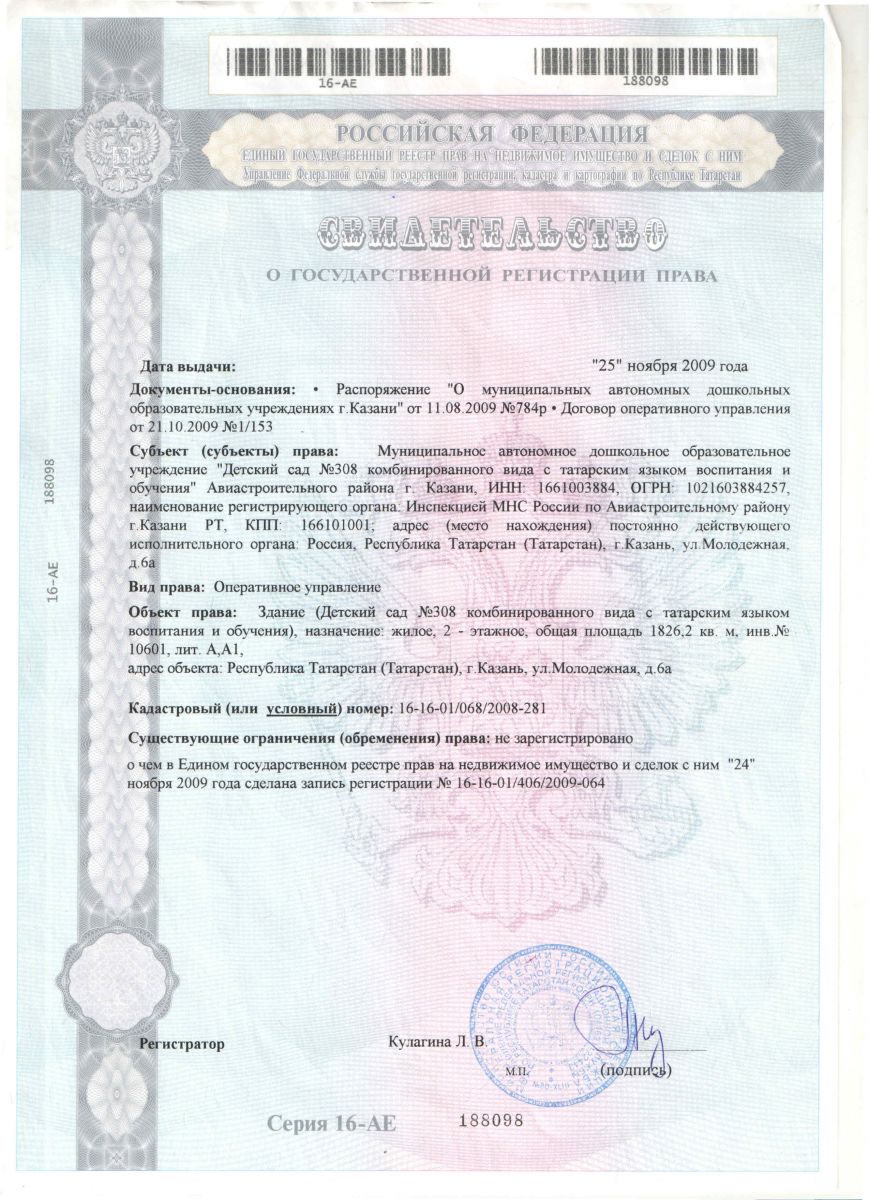 Свидетельство о государственной регистрации права на здание детского сада