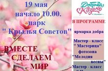 В рамках программы " Добрая Казань" 19 мая с 10.00. часов в парке " Крылья Советов" состоится семейный праздник " Вместе сделаем мир добрее" Каждый ребенок сможет принять активное участие в празднике. Нас ждут интересные игры- эстафеты, призы. В студии семейного театра малыши смогут воплотиться в мир сказки.
