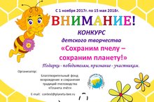 Напоминаем, что с 1 ноября 2017 по 15 мая 2018 проходит региональный этап Международного конкурса детских рисунков "Сохраним Пчелу-Сохраним Планету!", организованный Благотворительным Фондом возрождения и сохранения традиций пчеловодства "Планета Пчел".