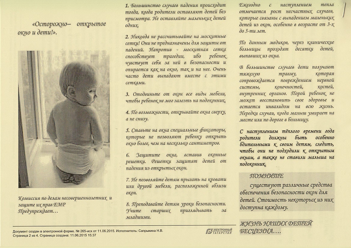 В последней декаде мая и начале июня 2017г в РТ было зафиксировано 5 случаев травмирования малолетних детей вследствие выпадения из окон жилых помещений (2 случая со смертельным исходом и 3 случая с тяжелыми последствиями для здоровья). Данные факты свидетельствуют, в том числе, о ненадлежащем исполнении родителями родительских обязанностей, за которое предусмотрена административная ответственность.