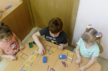 Наигрались, приступаем к геометрическому конструированию. Выкладывание, в том числе, счетного материала Кюизенера, является самым приятным для дошкольников способом изучить начальную геометрию. Этим и занимаются дети младшей группы со своим воспитателем. -