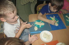 В средней группе идет реализация проекта "Снегурочка", на фото дети лепят из соленого теста.