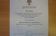 Дипломом lll степини награждается Баганова Наталья Анатольевна за участие и победу во Всероссийском дистанционном конкурсе методических разработок по формированию исследовательских умений детей дошкольного возраста "Радуга открытий". Тема конкурсной работы "В гости к Золушке". Поздравляем Наталью Анатольевну с победой!!! Поздравляем!!!