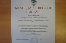 Организаторы Всероссийского дистанционного конкурса "Радуга открытий" выражают благодарность заведующей ДОУ Кузнецовой Светлане Александровне за понимание важности поддержки образовательных инициатив талантливых педагогов и их воспитанников.