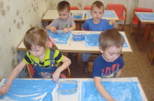 На первом занятии кружка "Радуга в ладошках" дети рисовали морские глубины. Для работы им понадобилась бумага, синяя гуашь и паролоновая губка. А дальше дело техники.