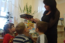 Дети вместе с Алиной Салимовной посадили лук, а теперь с большим удовольствием ухаживают за ним, рассматривают, наблюдают, беседуют. На фото дети рассматривают корни лука. Сегодня, Алина Салимовна предложила попробовать лук во время обеда и узнать правда ли от лука плачут.