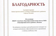 Наша школа участвовала в республиканском конкурсе на лучшую подготовку образовательного учреждения к новому учебному году и заняла 2 место в Авиастроительном и Ново-Савиновском районах города Казани. Поздравляем!!!
