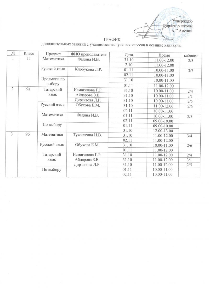 График дополнительных занятий с учащимися выпускных классов в осенние каникулы