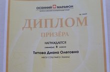 Дипломом призёра награждена ученица 8Б класса Титова Диана Олеговна по биологии в всероссийском познавательном турнире "Осенний марафон". Поздравляем!