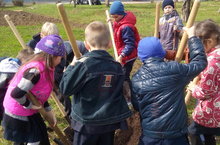 Сегодня учащиеся 1 класса посадили в школьном саду дерево. Молодцы!