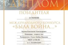 По итогам Международного конкурса «Была война…» ученик 11 класса Баушин Константин и учитель истории и обществознания Салун Любовь Ивановна получили дипломы 2 степени в номинации «Очерки и эссе». Поздравляем Константина и Любовь Ивановну!!! Желаем дальнейших побед!