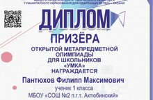 20 апреля в Центре одаренных детей города Казани прошла очная метапредметная олимпиада «Умка». Ученик 1А класса Пантюхов Филипп применил все свои знания, усердно выполнил непростые задания и стал призером, с чем поздравляем его и классного руководителя Зульфию Тагировну!