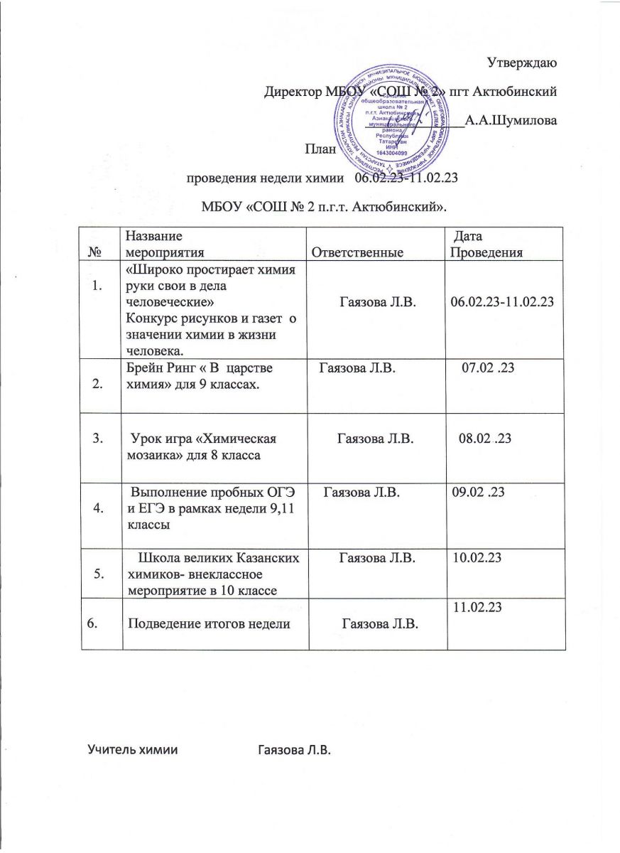 С 6 по 11 февраля в нашей школе проходит неделя химии. План недели