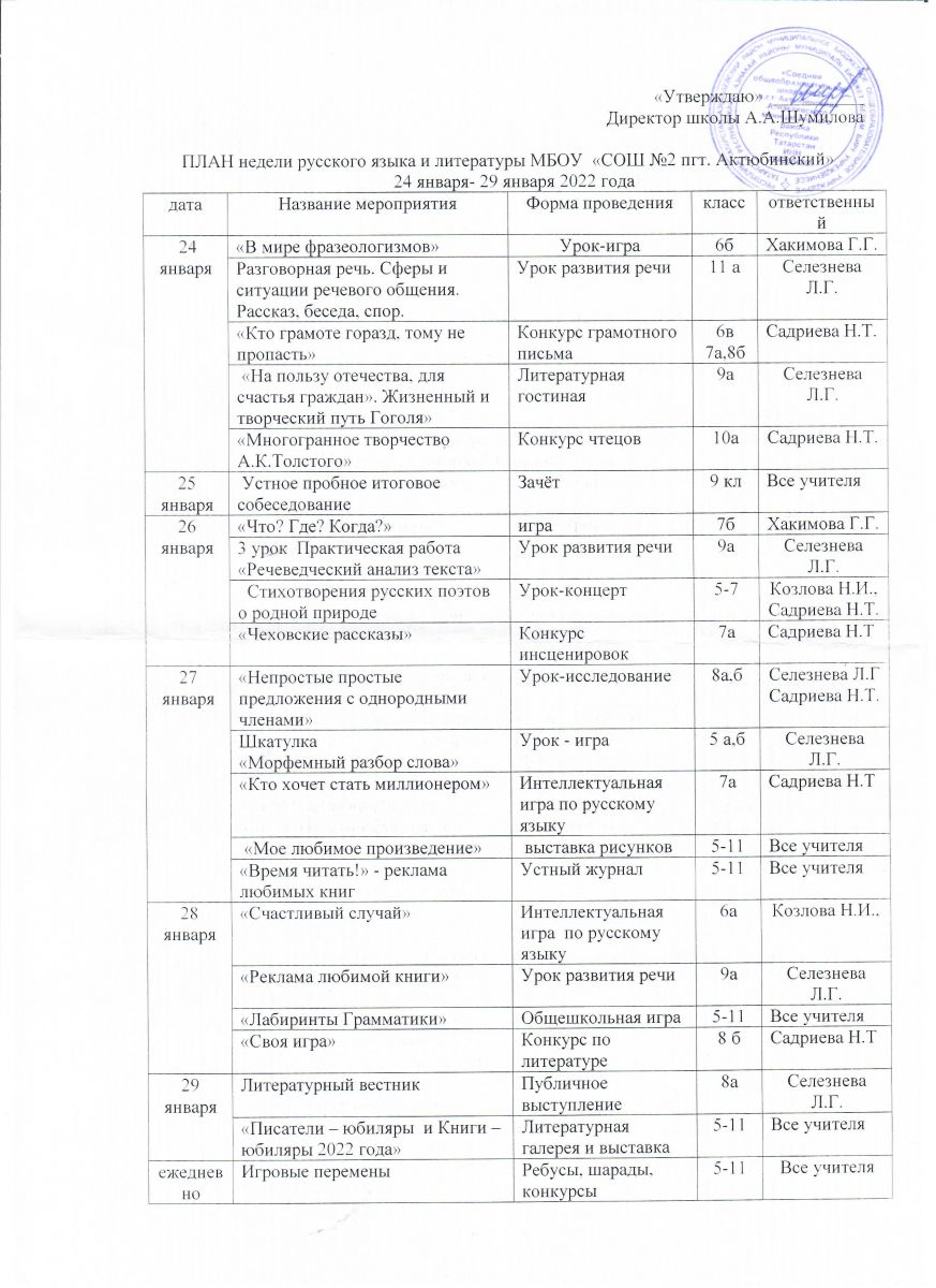В нашей школе стартовала неделя русского языка и литературы. План недели