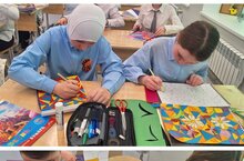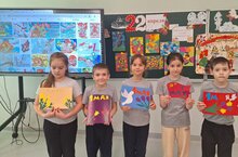 Преддверии Дня Победы на уроке технологии учащиеся 2 "Б" класса выполнили интересную тематическую аппликацию. Красная звезда, голубь Мира в обрамление георгиевской ленты - одни из главных символов Победы.