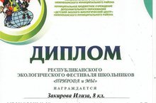 Дипломом Республиканского экологического фестиваля школьников "Природа и мы" награждается ученица 8Б класса Закирова Илиза.Она заняла II место в конкурсе "Сохраним природу вместе".Пожелаем ей творческих успехов!