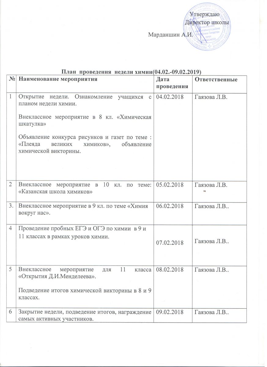 C 4 по 9 февраля в нашей школе пройдет Неделя химии.Ребята смогут показать свои знания по химии на открытых уроках, в конкурсах, викторинах, играх.План недели⇒4-9нчы февральгә кадәр мәктәптә химия атналыгы үтәчәк.Укучылар барлык чараларда актив катнашып үзләренең белемнәрен, осталыкларын күрсәтәчәкләр. -