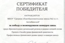 По итогам осенней серии проекта среди образовательных организаций «Онлайн уроки финансовой грамотности. Профессионалы финансового рынка придут в каждую школу», проводимые Центральным Банком Российской Федерации (Банк России) - наша школа награждена сертификатом ПОБЕДИТЕЛЯ. Основными критериями отбора победителя являлось: количество уроков, в которых учебное заведение приняло участие, своевременность и качество отзывов учителей. В нашей школе онлайн уроки финансовой грамотности проводили Закирова А.Г. и Оджимамадова А.Д.