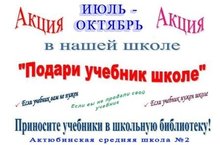 В школе продолжается акция "Подари учебник школе" Если вам стал не нужным какой-либо учебник, поучавствуй в благотворительной акции. Принеси такой учебник или художественную литературу в шкоьную библиотеку.