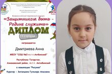 1 сыйныф укучысы Дмитриева Анна "Ватанны саклаучы булу-Ватанга хезмәт итү" Бөтенроссия иҗади конкурсында катнаша һәм 1 урынны ала. Бик яхшы!