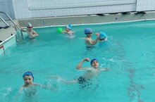 После обеда в пришкольном лагере были водные процедуры, ребята резвились в бассейне под присмотром инструкторов.