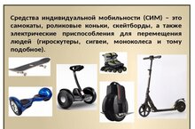 ???? Средство индивидуальной мобильности (СИМ) - транспортное средство, имеющее одно или несколько колес (роликов), предназначенное для индивидуального передвижения человека посредством использования двигателя (двигателей) (электросамокаты, электроскейтборды, гироскутеры, сигвеи, моноколеса и иные аналогичные средства).