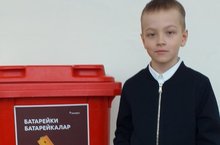 Ученик 2 класса Сабирзянов Данир участвует в сборе отработанных батареек.