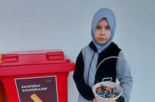 Ученица 4 класса Муллина Аиша участвует в акции по сбору использованных батареек. Цель акции: воспитывать экологически грамотное поведение в окружающей среде.