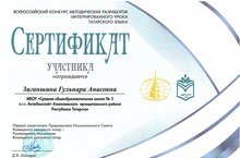 Учителя нашей школы Камаева Л.Р.-учитель русского языка и литературы,Рахимзянова Л.Ф. -учитель родного языка и литературы, Зиганшина Г.А.-учитель начальных классов стали участниками Всероссийского конкурса методических разработок интегрированного урока татарского языка, который проводил Всемирный конгресс татар и награждены сертификатами участника.