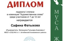 Муса Җәлилнең тууына 120 ел тулуга багышланган "Кызыл ромашка" IV республика патриотик конкурсында 1 урынны алган 3 класс укучысы Фатыйхова Сафинаны котлыйбыз. Молодец, алга таба да уңышлар телибез!
