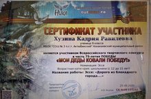 Учащиеся 8 класса Хузина Кадрия, Муллаянова Камилла участвовали во Всероссийском творческом конкурсе в четь 75 летия Великой Победы в номинации "Эссе" и получили Сертификаты участия.Поздравляем!