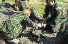 Одна из опушек близ деревни Алферовка в эти дни напоминала военный городок: повсюду парни с серьезными лицами и автоматами наперевес, стройные ряды палаток, в стороне проходят занятия по физподготовке, рядом была развернута полевая кухня.