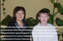 По итогам муниципального этапа всероссийского конкурса для школьников "Моя малая Родина: природа,культура, этнос" победителем гуманитарно-экологического исследования стал ученик 8 класса Сабирзянов Нияз (руководитель Сабирзянова Розалия Наилевна)