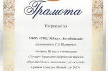 В рамках конкурса "Новый год - 2013" школа заняла 3 место в номинации "Лучшее Новогоднее оформление фасадов образовательных, дошкольных учреждений"