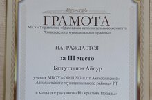 Ученик 4 класса Базгутдинов Айнур стал призёром творческого конкурса "На крыльях Победы".Поздравляем, молодец!