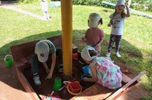 Җәй көне балалар бакчасында саф һавада бик күп күңелле һәм файдалы уеннар уздырабыз, хәрәкәтләрне координацияләү һәм җитезлекне үстерүгә ярдәм итәбез. Шулай ук туплар, чабышкылар белән уеннар, хәтер һәм игътибар үсеше өчен уеннар оештырабыз. Уеннар балаларның яшенә җайлашкан һәм аларның мәнфәгатьләренә туры килә.