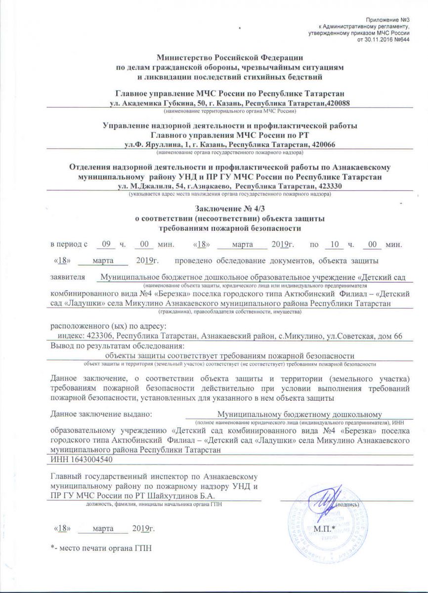 Заключение МЧС о пожарной безопасности объекта МБДОУ д/с "Ладушки" с. Микулино.