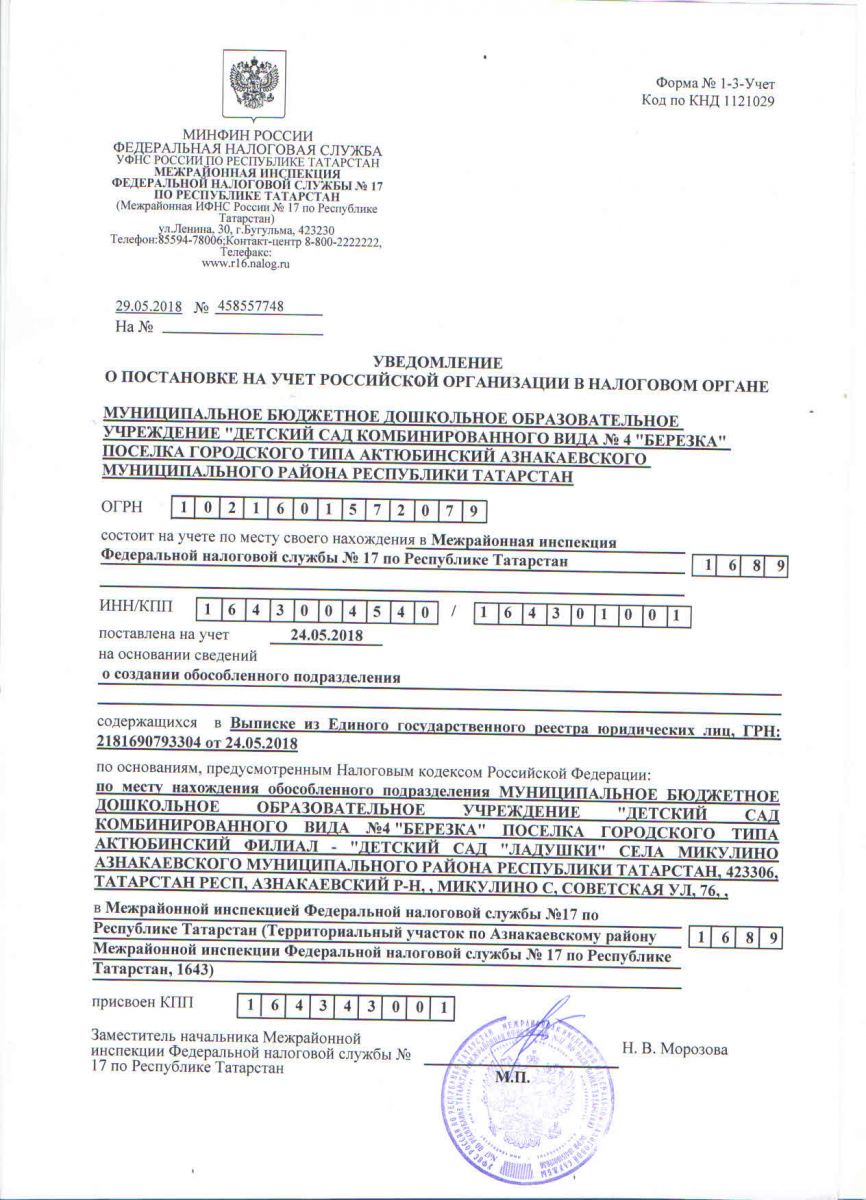 Уведомление о постановке на учет Российской организации в налоговом органе с. Микулино.