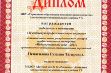 Диплом МКУ «Управление образования исполнительного комитета Азнакаевского муниципального района РТ» Награждается победитель в номинации «За активную профессиональную позицию» участник муниципального этапа республиканского конкурса профессионального мастерства «Педагог – психолог года 2015г» Исмагилова Гузалия Тагировна, педагог – психолог МБДОУ «Детский сад комбинированного вида №12 «Росинка» г. Азнакаево Азнакаевского муниципального района РТ. 11.08.2015