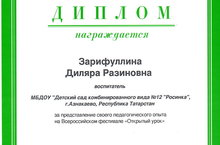 Всероссийский фестиваль педагогический идей «Открытый урок» ДИПЛОМ награждается Зарифуллина Диляра Разиновна воспитатель – МБДОУ «Детский сад комбинированного вида №12 «Росинка» г. Азнакаево за представление своего педагогического опыта на Всероссийском фестивале «Открытый урок» конспект НОД «Зимняя сказка». 13.08.2015