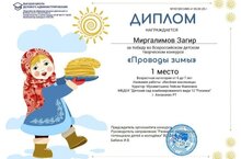 1 место во Всероссийском детском конкурсе "Проводы зимы" , Миргалимов Загир, подготовительная к школе группа, воспитатель Мухаметшина Л. Ф. Рәсәйкүләм бәйгедә 1 нче урын, Миргалимов Загир, мәктәпкәчә әзерлек төркеме, тэрбияче Мөхәмәтшина Л.Ф. 10.03.2025