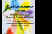 МБУ "Молодёжный Центр Азнакаевского муниципального района" Благодарственное письмо воспитателю Халимовой Г.А. За содействие в проведении Всероссийской добровольческой акции "Весенняя неделя добра" 30.04.2014