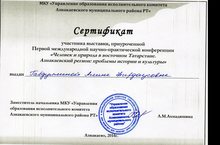 МКУ "Управление образования исполнительного комитета Азнакаевского муниципального района РТ" Сертификат участника выставки, приуроченной Первой международной научно-практической конференции "Человек и природа в восточном Татарстане. Азнакаевский район: проблемы истории и культуры" выдан Габдуллиной Алине Фирдаусовне, Давлетшиной Альфинур Фанзировне, Хазиевой Гульнаре Зуфаровне, Фасиевой Хамдие Инсафетдиновне, Нурсаетовой Лейсан Фаизовне, Халимовой Гульнаре Ахтямовне 23.05.2014