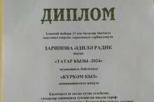 Диплом Зарипова Адиля Радик кызы "Татар кызы - 2024" муниципаль бэйгесендэ "Күркәм кыз" 25.04.2024